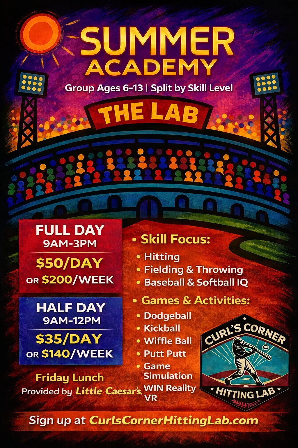 The Summer Baseball & Softball Academy at Curl’s Corner Hitting Lab is a high-energy development program built to help athletes improve during the season, not fall behind.